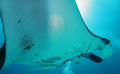 Les raies manta sont présentes sur plusieurs sites en Papouasie occidentale de l'archipel des Raja Ampat. Auteurs : Sophie Fallourd, Michel Cantou et Sébastien Cantou